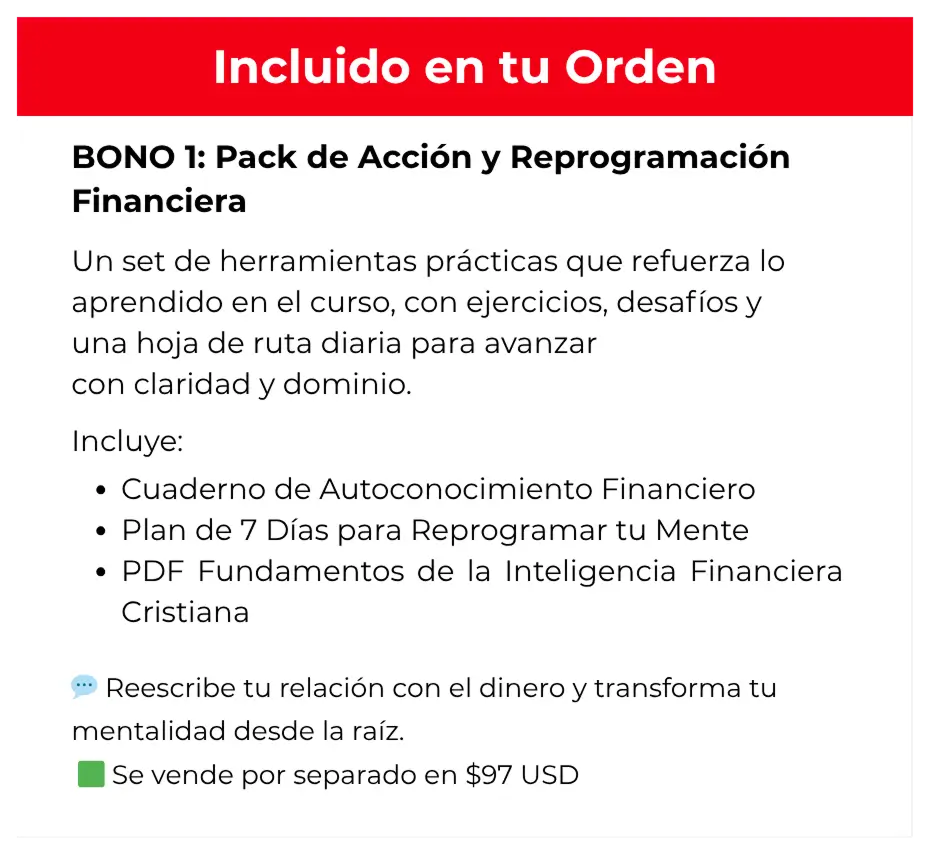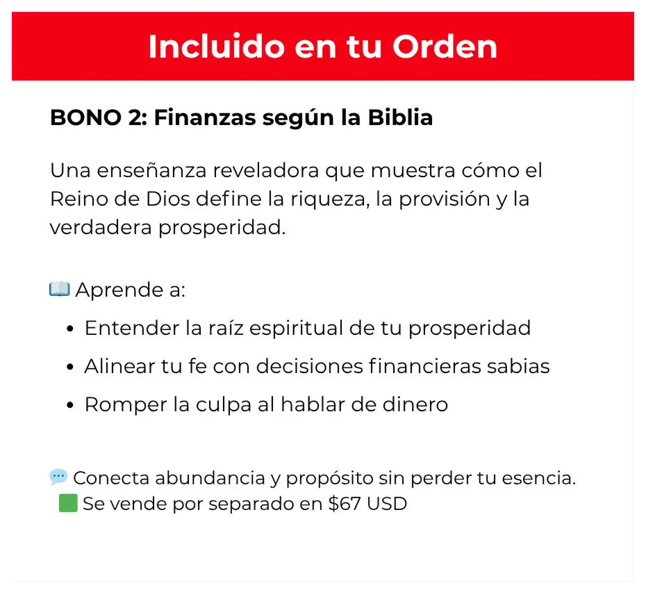 🎁 BONO #2: Finanzas según la Biblia (Clase grabada)Descubre los principios del Reino que transforman tu manera de ver el dinero.Valorado en $67 USD